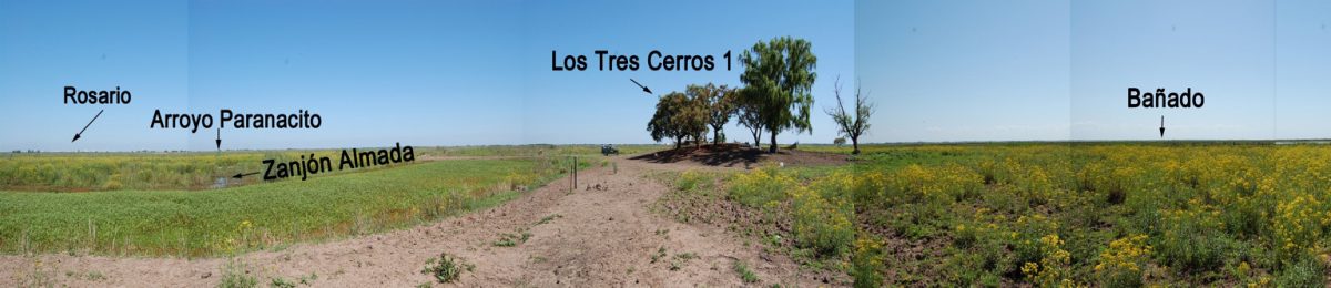 Estudios de investigadores arqueológicos de la Universidad Nacional de La Plata sobre los Tres Cerros indican que se trata de una elevación artificial a la que se agregaron arcillas, tierras quemadas, huesos y fragmentos de vasijas para aumentar su altura y cohesión. La superposición de capas sirvió, entre otras cosas, para proteger el sitio de las crecidas del río.