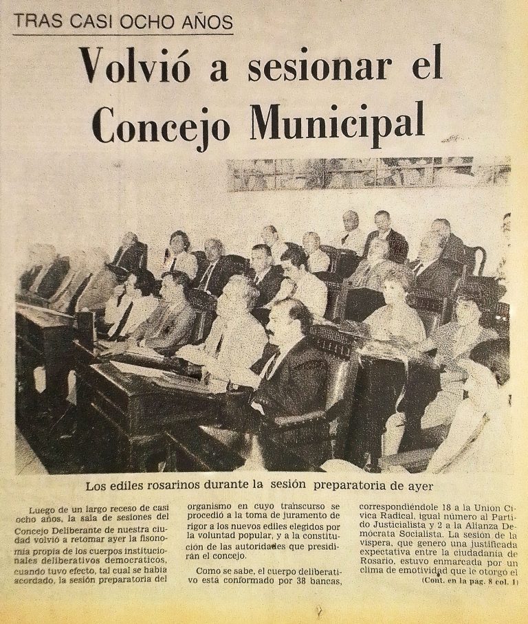 El Concejo de ese período estaba compuesto por 38 ediles, con igual cantidad de bancas para la UCR y el Partido Justicialista, y dos para la Alianza Demócrata Socialista.